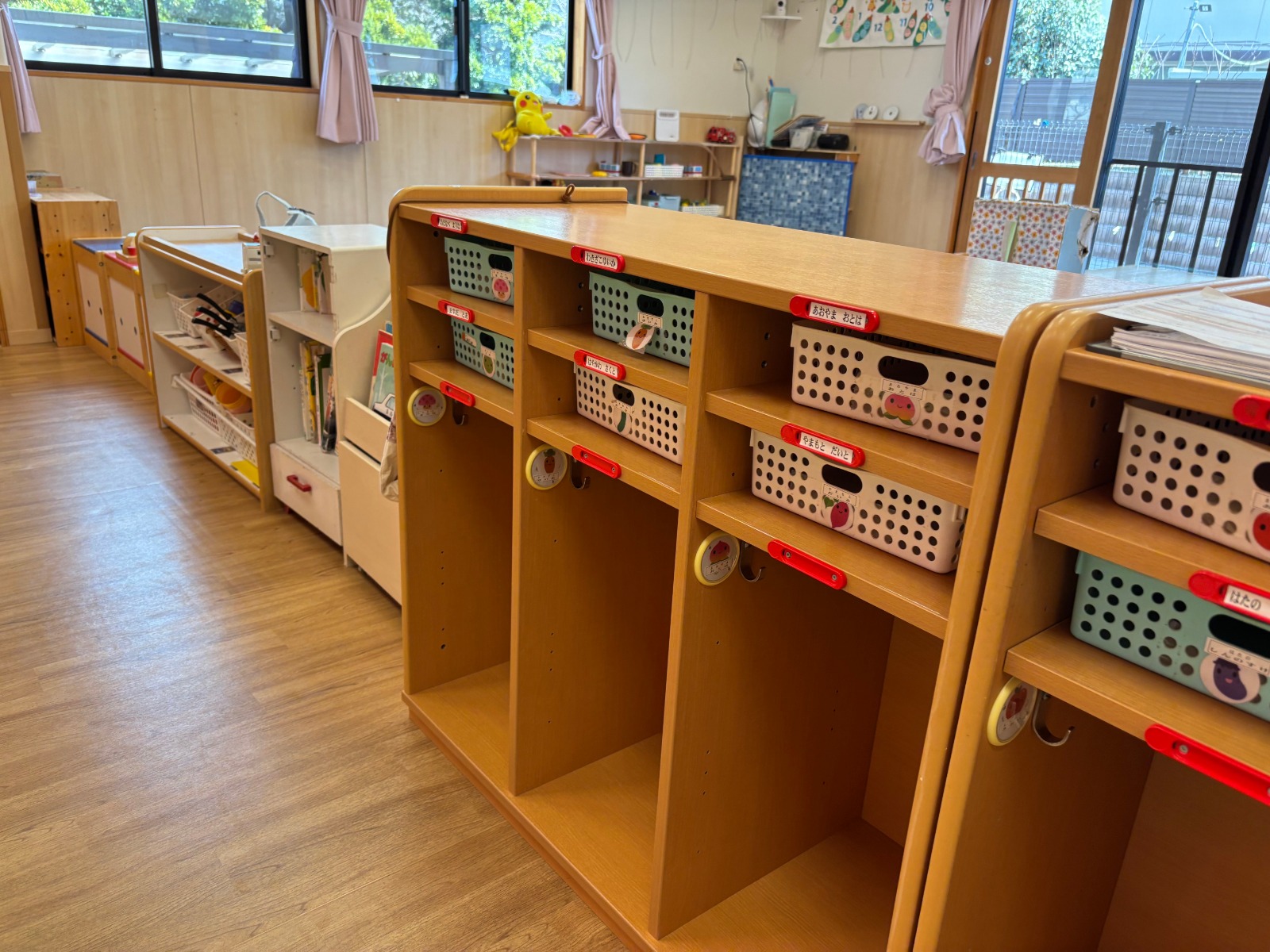 ロッカーで仕切り、1.2歳のクラスを分けています。