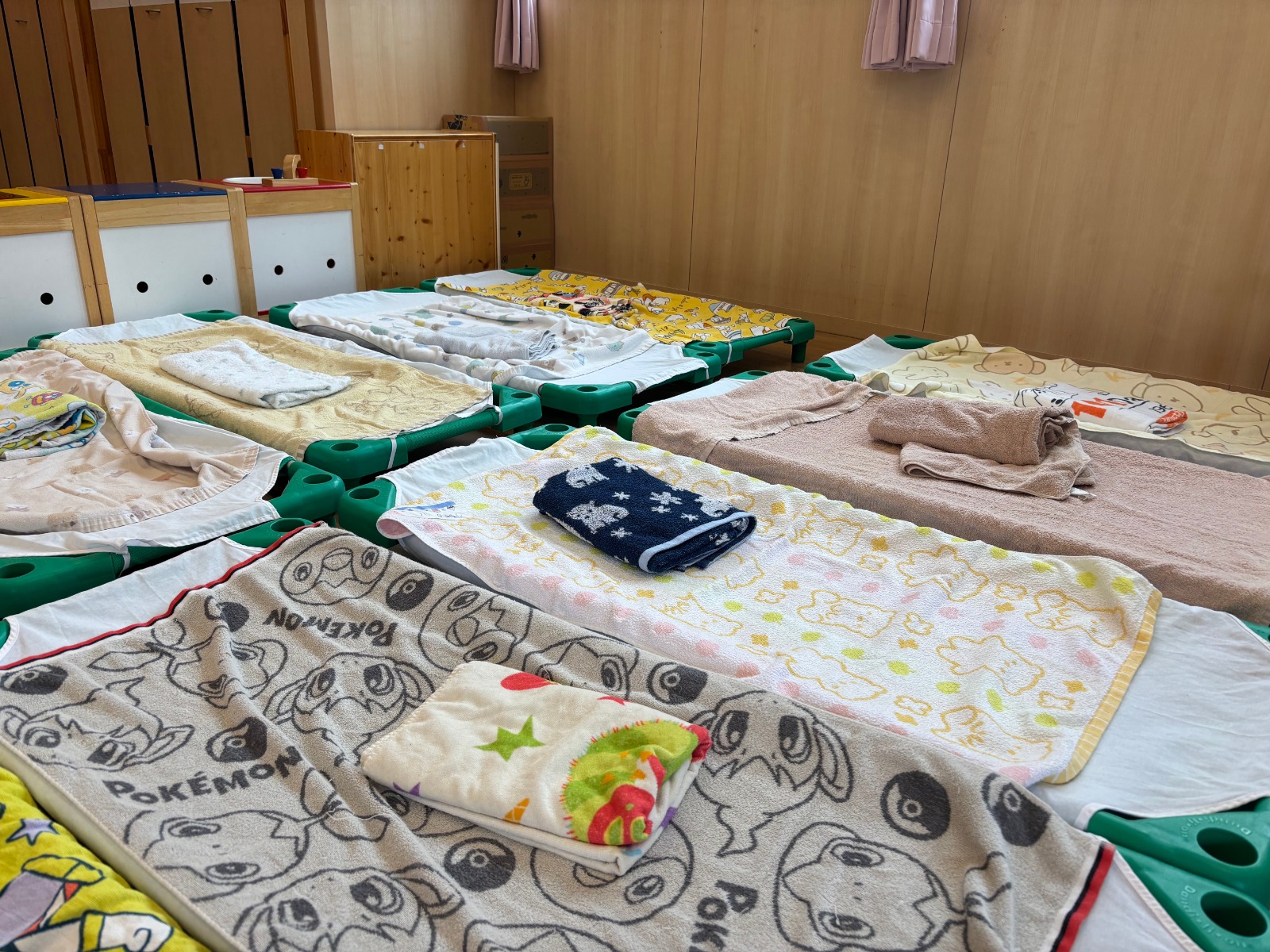 給食後は保育室の一角にコットを配置してお昼寝です。